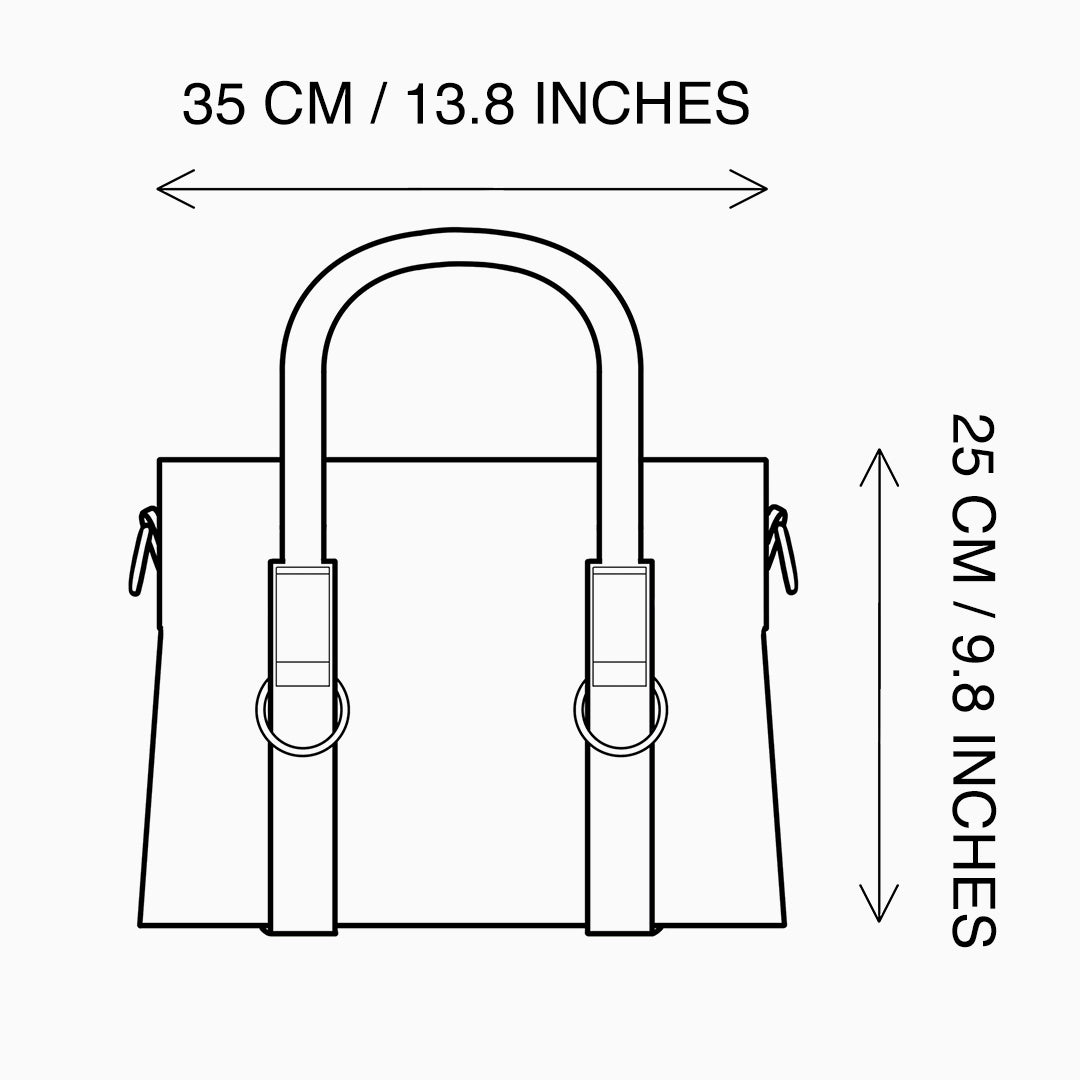 Bag size: height - 25 cm (9.8 inches), width - 35 cm (13.8 inches), side - 12 cm (4.7 inches).